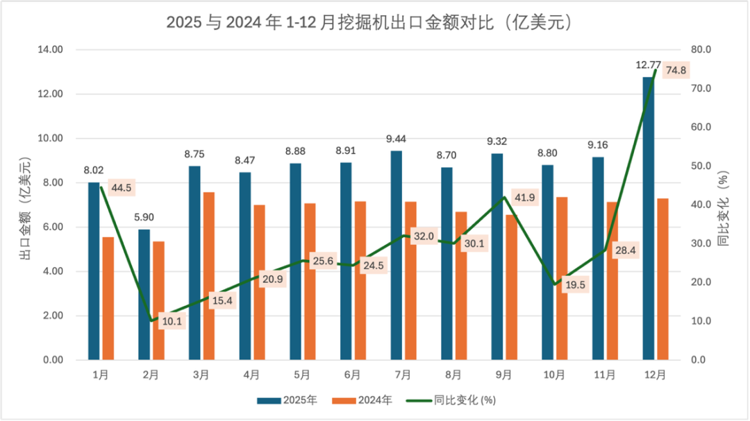 Iz mesečnih podatkov je izvozna uspešnost bagrov goseničarjev tesno usklajena s celotnim trgom, z enomesečno vrednostjo izvoza v višini 1,228 milijarde USD v decembru, kar pomeni 74,0-odstotno medletno povečanje, in obsegom izvoza 34.000 enot, kar je 65,0-odstotno povečanje medletno, kar kaže na pomemben zagon rasti ob koncu leta. Kar zadeva medletne spremembe, sta tako vrednost kot obseg izvoza v vseh mesecih dosegla pozitivno rast, pri čemer sta septembrski obseg povečal za 57,9 % in decembrska vrednost povečala za 74,0 %, kar sta ključna poudarka letošnje rasti.