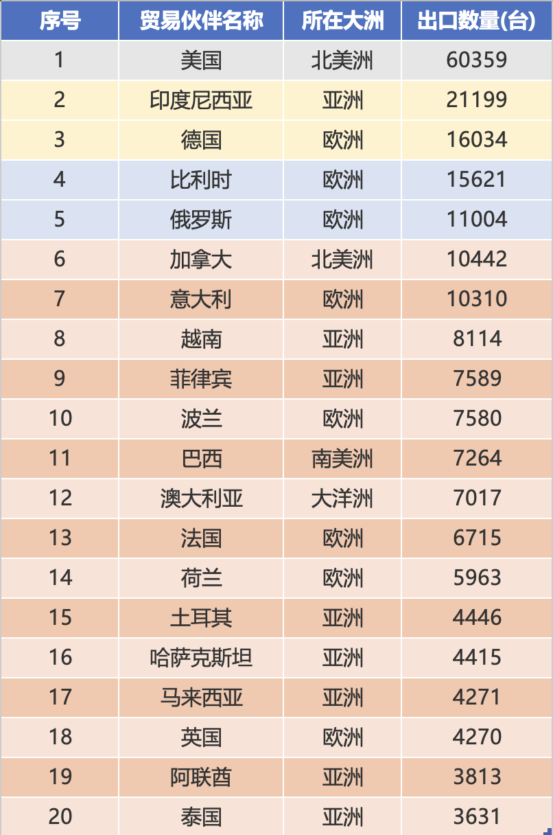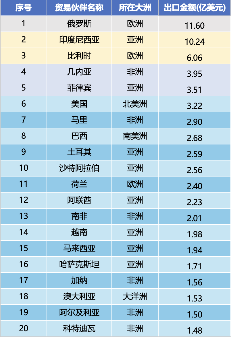 Kar zadeva regionalno porazdelitev, prvih deset partnerjev pokriva pet regij: Evropo (Rusija, Belgija), Azijo (Indonezija, Filipini, Turčija, Savdska Arabija), Afriko (Gvineja, Mali), Severno Ameriko (ZDA) in Južno Ameriko (Brazilija), od tega 40 % azijskih držav; Rusija je bila na vrhu lestvice z 1,16 milijarde dolarjev in je postala največji čezmorski trg za kitajske bagre; Indonezija, kot osrednji trg v Aziji, je izvozila več kot 1 milijardo ameriških dolarjev, kar dokazuje velik obseg povpraševanja; Gvineja in Mali v Afriki sta se uvrstila med prvih deset z velikimi nakupi in postala osrednja središča rasti na nastajajočih trgih.
